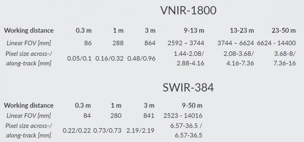 典型HySpex系統相機: 近攝鏡頭的工作距離為數公分,分辨率最高為24μm,工作距離最大為50m。下表列出VNIR-1800和SWIR-384的主要鏡頭規格: