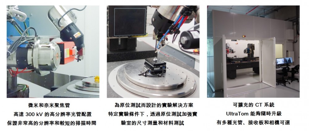 UltraTom 可以配備多達三個高功率和高分辨率 X 射線光管組合,以及多種偵測接收板和相機,能夠輕鬆更換系統配置來滿足最嚴苛的應用需求。UltraTom 具有終極分辨率低至 0.4 µm,即使在低能量水平下也能提供高品質成像所需的清晰細節,以及平衡的對比度和亮度。