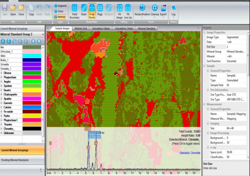 amics 過程顯示礦物類列表、地圖、x 射線點和波譜